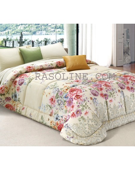 Trapunta invernale matrimoniale Double face " FERRARUCCIA " Trapunta è realizzata in morbida microfibra mano pesca (materiale pratico e resistente che si asciuga facilmente e non è necessario stirarlo). Il prodotto è double face, da un lato è stampato con una splendida fantasia floreale e dall'altro in colore avorio (come da foto). Il prodotto è confezionato con bordo alto, gli angoli leggermente arrotondati e la trapuntatura a rombi. Tessuto sopra Microfibra 100% Tessuto sotto Microfibra 100% Imbottitura in morbida fibra anallergica  da 350 gr/mq. Dimensioni   cm  260 x 260 Confezione: Busta trasparente e tnt Idea regalo Prodotto da GF Ferrari Made in italy