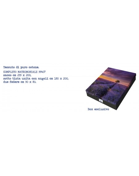COMPLETO COPRIPIUMINO MATRIMONIALELavender SunsetTESSUTO IN PURO COTONE 100%STAMPA DIGITALEDIMENSIONI : COPRIPIUMINO 255 x 200 cm LENZUOLO SOTTO CON ANGOLI 180 x 200 cm DUE FEDERE 50 x 80 cmLAVABILE IN LAVATRICE A 40° BOX ESCLUSIVO BY CALEFFI