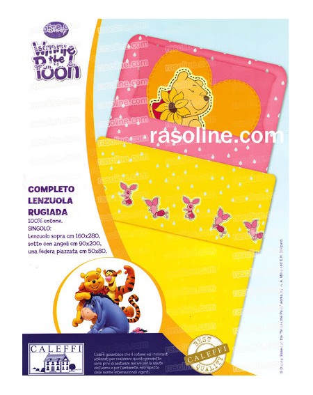 COMPLETO LENZUOLA WINNIE THE POOH "RUGIADA" colore GIALLO - ROSA Puro cotone LETTO SINGOLO Lenzuolo sopra cm 160x280, Lenzuolo sotto con angoli cm 90x200, Federa cm 50x80. ORIGINALE DISNEY BY CALEFFI