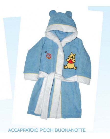 ACCAPPATOIO " BUONANOTTE "WINNIE THE POOHcon cappuccio. Realizzato in morbida spugna di cotone.L'accappatoio è abbellito con i disegni ricamati e con applicazione delle orecchiette sul cappuccio(come da foto).Caleffi garantisce che i colori utilizzati rispettano la naturale acidità della pelle del bambino e sono privi di sostanze nocive per la salute.