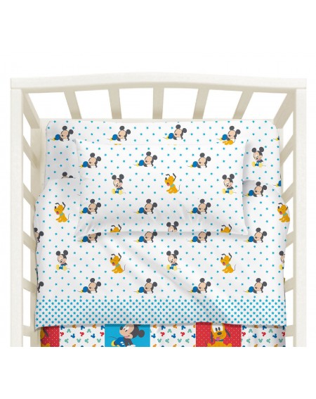 Completo lenzuola per lettino Mickey Patch Lenzuolo sopra cm 110x180 Lenzuolo sotto con angoli cm 60x130 Federa cm 40x55