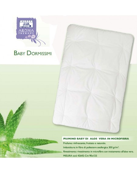 PIUMINO BABY DI ALOE VERA IN MICROFIBRA Profumo: rinfrescante, fruttato e naturale. Imbottitura: in fibra di poliestere anallergica 300 gr/m2 Rivestimento: rivestimento in microfibra con trattamento all’aloe vera.