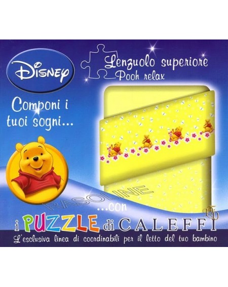 L'ESCLUSIVA LINEA COORDINABILI PER IL LETTO DEL TUO BIMBO COMPONI I TUOI SOGNI CON I PUZZLE DI CALEFFI !!! LENZUOLO SUPERIORE SINGOLO "POOH RELAX" DIMENSIONI : 160 x 280 cm TESSUTO DI PURO COTONE FILATO DI PURO COTONE SOLO COLORANTI ATOSSICI COLORE DI SFONDO - ROSA