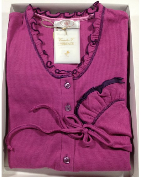 PIGIAMA LUNGO SERAFINO modello SALLY Il pigiama è realizzato in morbido cotone a costina. Le stampe sono definite bene, resistenti ai lavaggi e morbide. Le cuciture e le rifiniture degli orli sono curate e precise. Apertura della maglia è a serafino con bottoncini viola a forma quadrata, fino al sottoseno. Colletto è impreziosito con un volant arricciato con i profili ricamati in contrasto. La Maglia è abbellita con ricami e applicazione di tessuto in contrasto e strass a forma di fiocco. I polsini delle maniche sono arricciati, rifiniti con i profili smerlati e con applicazione del volant in tessuto in contrasto color viola anch'esso con i profili smerlati. Orlo della maglia termina con tre volant arricciati con i profili smerlati ricamati in contrasto. Il pantalone è stretto - leggings con i bordi smerlati. Tessuto in Cotone a Costina: 100% cotone Confezione: Elegante scatola (foto in basso). Idea regalo prodotto da Cornelia T. Versace (Gli altri accessori presenti nelle immagini non sono compresi nel prezzo.)