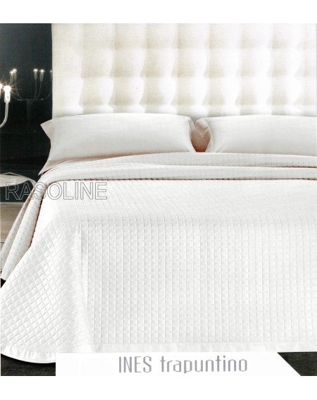 Copriletto trapuntato matrimoniale" INES "Confezionato a mano con tessuto tinto in filo.Copriletto è realizzato in raso di puro cotone di alta qualità e fifinito con doppio bordo.Gli angoli sono arrotondati e la trapuntattura e come da immagine.   Tessuto sopra Raso di puro Cotone 100%. Tessuto sotto Puro cotone 100%Imbottitura in morbida fibra anallergica da 100 gr/mq.Dimensioni   cm  265 x 265 Confezione: Busta trasparenteDisponibile anche completo lenzuola abbinato. Prodotto da GF FerrariMade in italy