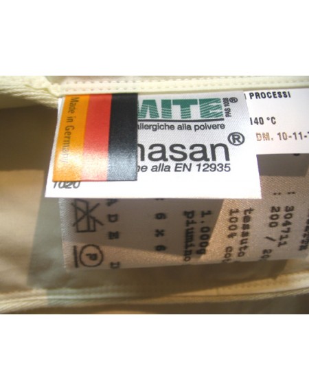 due piumini a cassette con asole e bottoniqualita' top "Böhmerwald" per letto matrimonialepiumino in vera piuma d'oca "duetto"piuma di origine europea made in germany modello "stockholm" 80 % piumino, 20 % piumetta cucito a cassettoni 7 x 6 peso : 650 + 1000 gr tessuto antipiuma in cotone 100% misura piumino 250 x 200 cmlavabile a 40° "Böhmerwald" azienda leader in germania esclusiva produzione di prodotti in piuma d'oca trattamento antiacaro denominato nomite per persone allergiche alla polvere.  Il marchio NOMITE vi segnala che si tratta di un prodotto idoneo alle persone che soffronodi allergie alla polvere domestica, visto che le caratteristiche termiche e climatiche degliarticoli da letto con imbottitura in piuma e piumino (rapido sviluppo del calore duranteil sonno, rapido rilascio di umidità durante la fase di aerazione) che sono favorevoliper l’uomo, creano invece un habitat veramente sfavorevole per gli acari dellapolvere, che dipendono dall’umidità.  IMBOTTITURA PIUMINO BIANCO D'OCA BAVARESE  CUCITO A CASSETTONICHE GARANTISCE UNA UNIFORME DISTRIBUZIONE DELLA PIUMA.